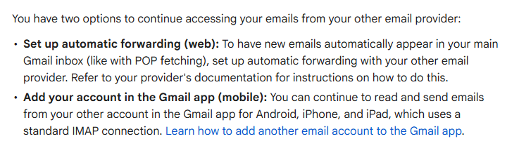 As you might have seen in your Gmail inbox, Google is ending support for POP email fetching in Gmail. You can still send emails as external accounts, but they just won’t fetch emails from your external accounts like they’ve been doing for years via POP. The two options they recommend are shown in this screenshot below. I decided to take the forwarding route.